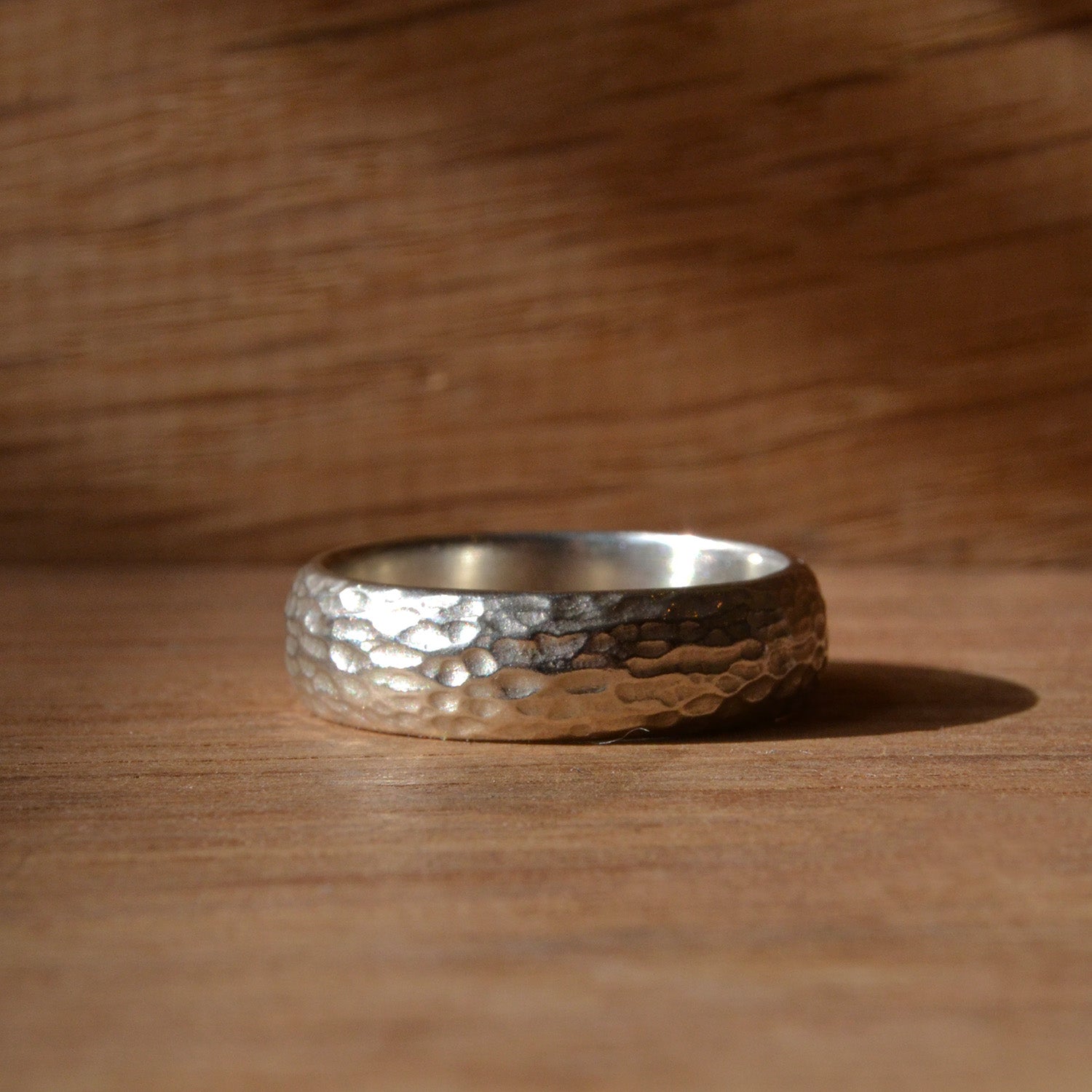 This thick silver ring band comes with an organic texture, which reminds me of tree bark...or the look of wood that has been chiseled by hand.